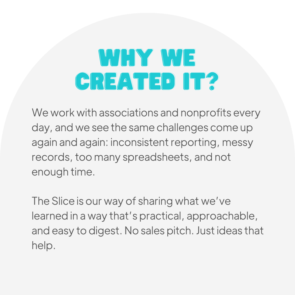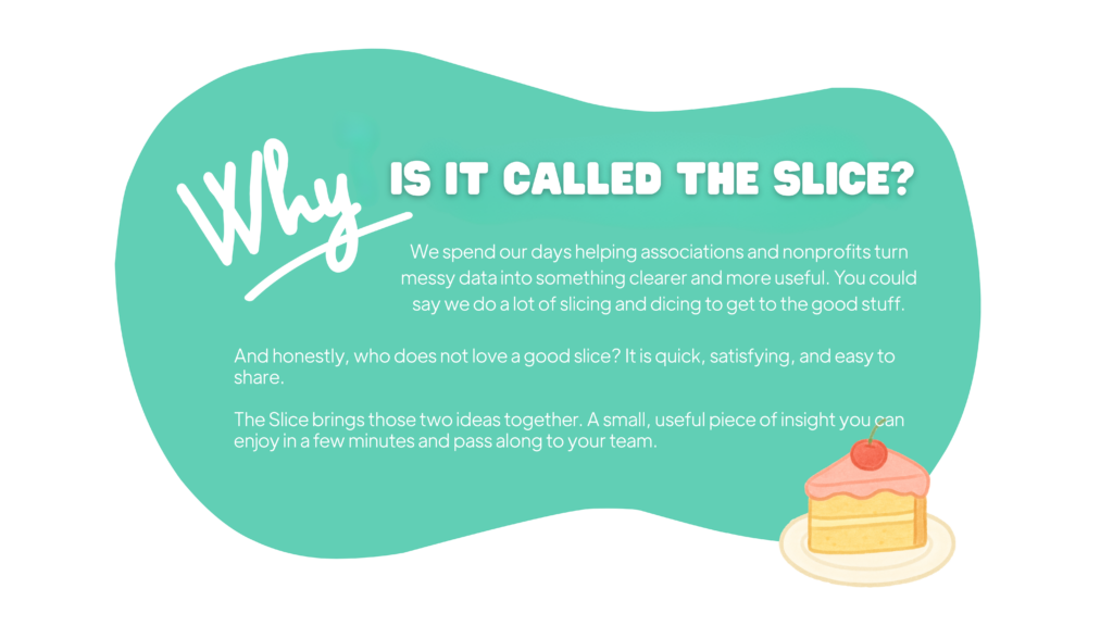 The Slice is a short, skimmable monthly newsletter created for associations and nonprofit professionals who want to work smarter with their data. It is meant to be easy to read, easy to share, and genuinely helpful.
